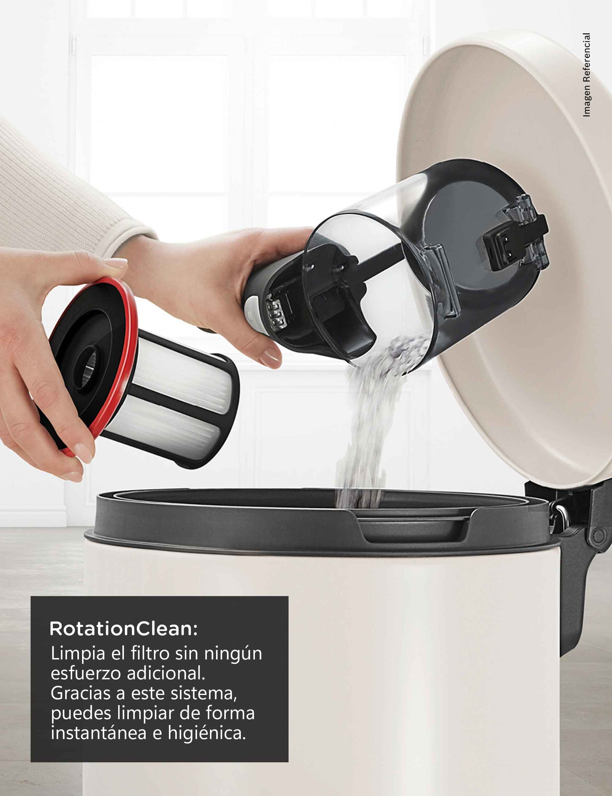 Puede vaciar el depósito sin crear una nube de polvo y puede limpiar el filtro sin lavar, sistema Rotation Clean. Simplemente retire el depósito de polvo, gire la rueda roja y vacíelo directamente en el contenedor.Elimina Pelo de Mascotas de Forma Eficaz y Rápida.