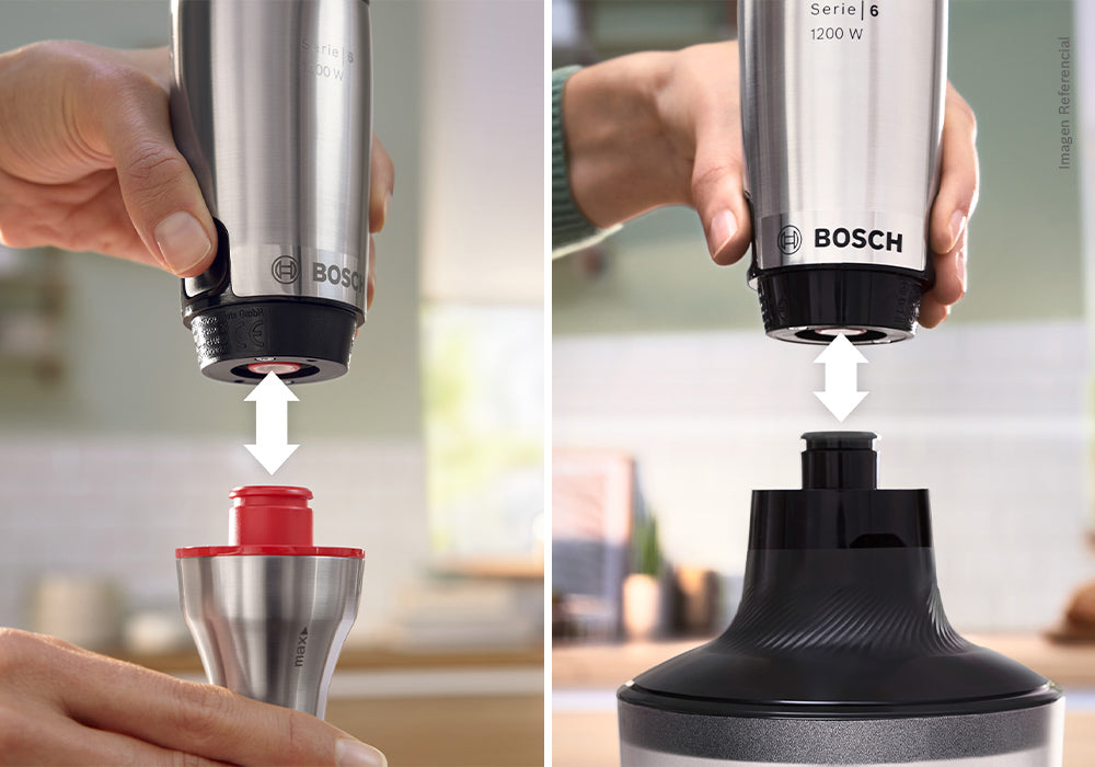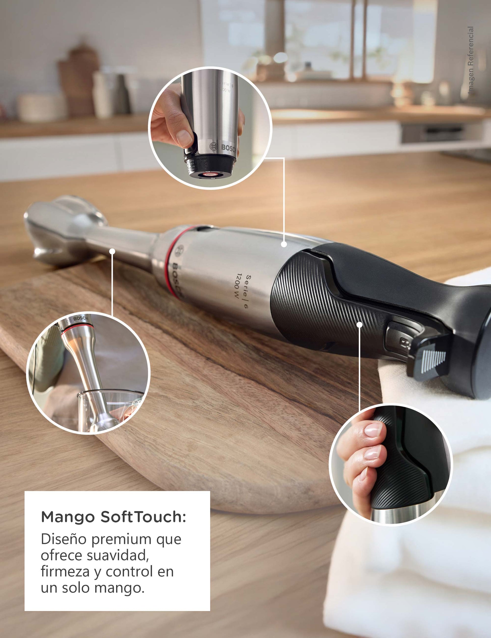 El mango SoftTouch ofrece una sensación de control absoluto en cada movimiento. Su textura antideslizante y su diseño ergonómico aseguran un agarre firme y estable, incluso durante preparaciones intensas. Bosch ha creado un mango que no solo se ve bien, sino que se siente perfecto: suave, seguro y diseñado para durar.