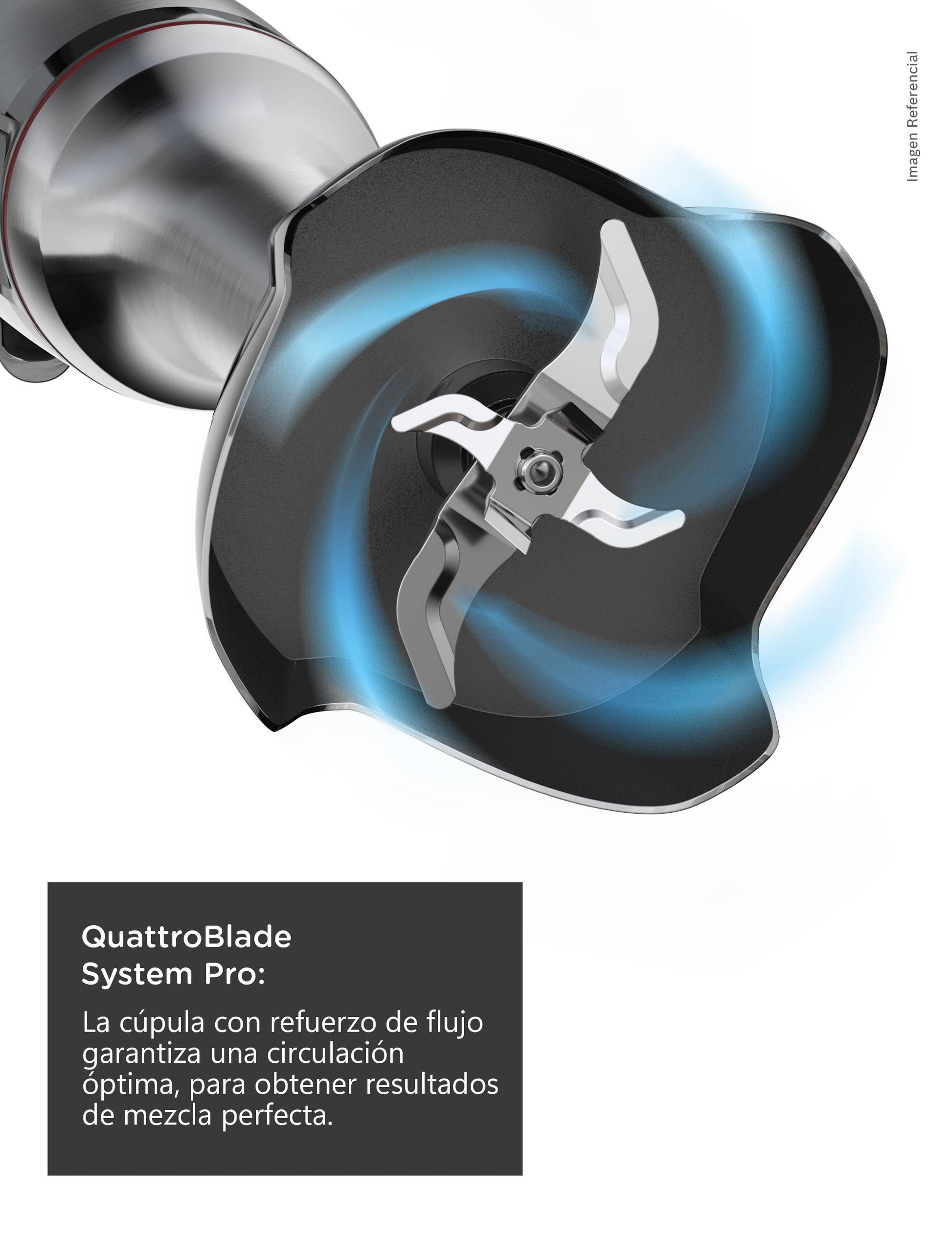 El QuattroBlade System Pro ingeniería Bosch en su máxima expresión. Su sistema de cuchillas de cuatro filos crea un flujo de corte continuo que mejora la circulación de los alimentos, evitando bloqueos y garantizando mezclas homogéneas. El diseño con bordes curvados reduce salpicaduras y mejora el rendimiento en cada movimiento.Un conector de larga vida.