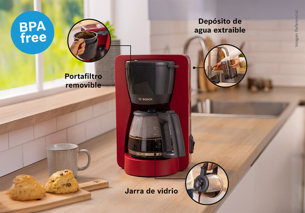 Sus piezas plásticas BPA-Free garantizan que obtengas en cada taza el mejor aroma y el sabor más puro sin otros residuos nocivos. Vive la experiencia Bosch: pasión por el café y por tu salud.