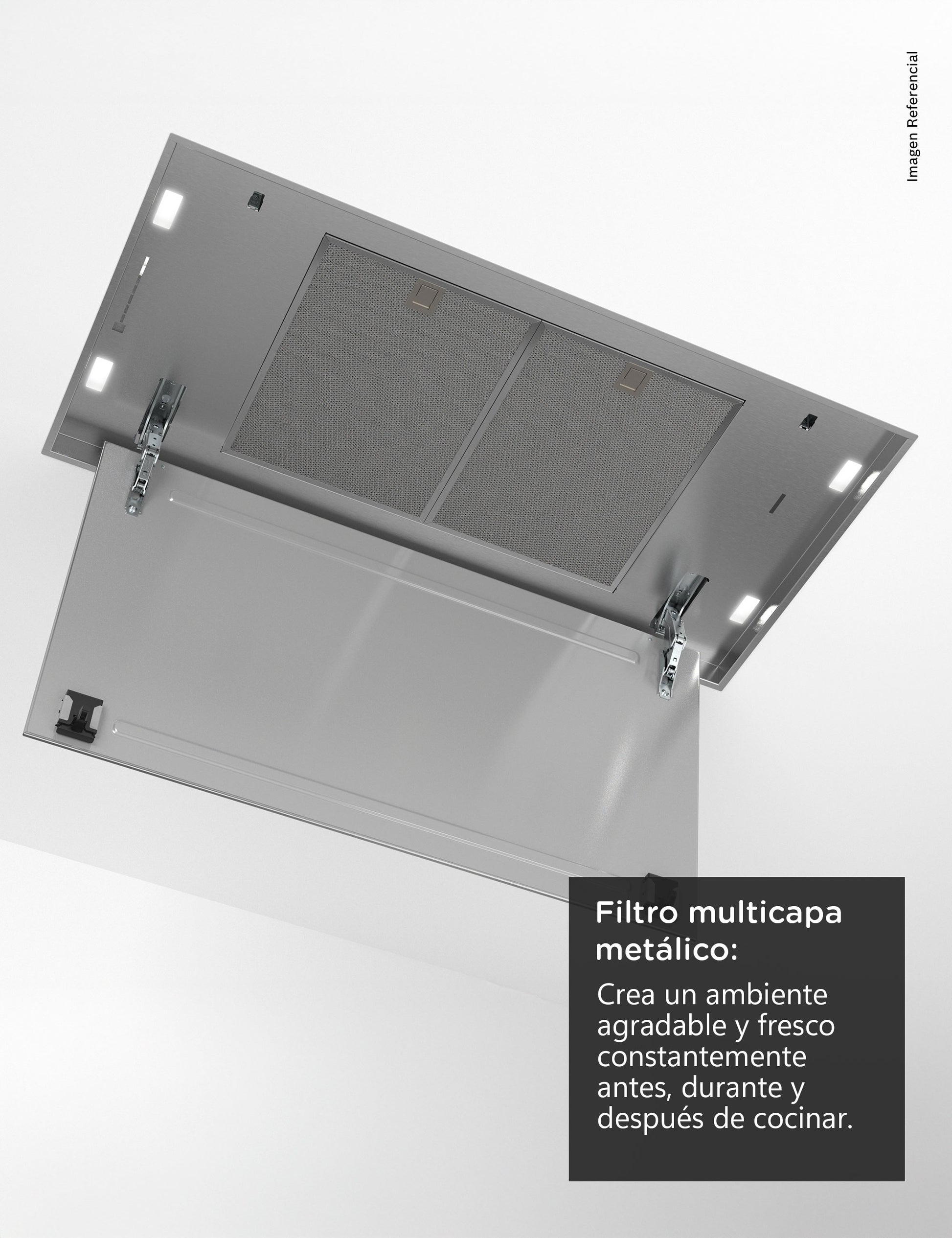 Este motor es muy eficiente y silencioso. Permite mejorar la capacidad de extracción, reducir el nivel de ruido y el consumo de energía hasta en un 80%. Resultado: máxima extracción con hasta el 20 % menos de ruido.Filtro Multicapa + Marco Acero