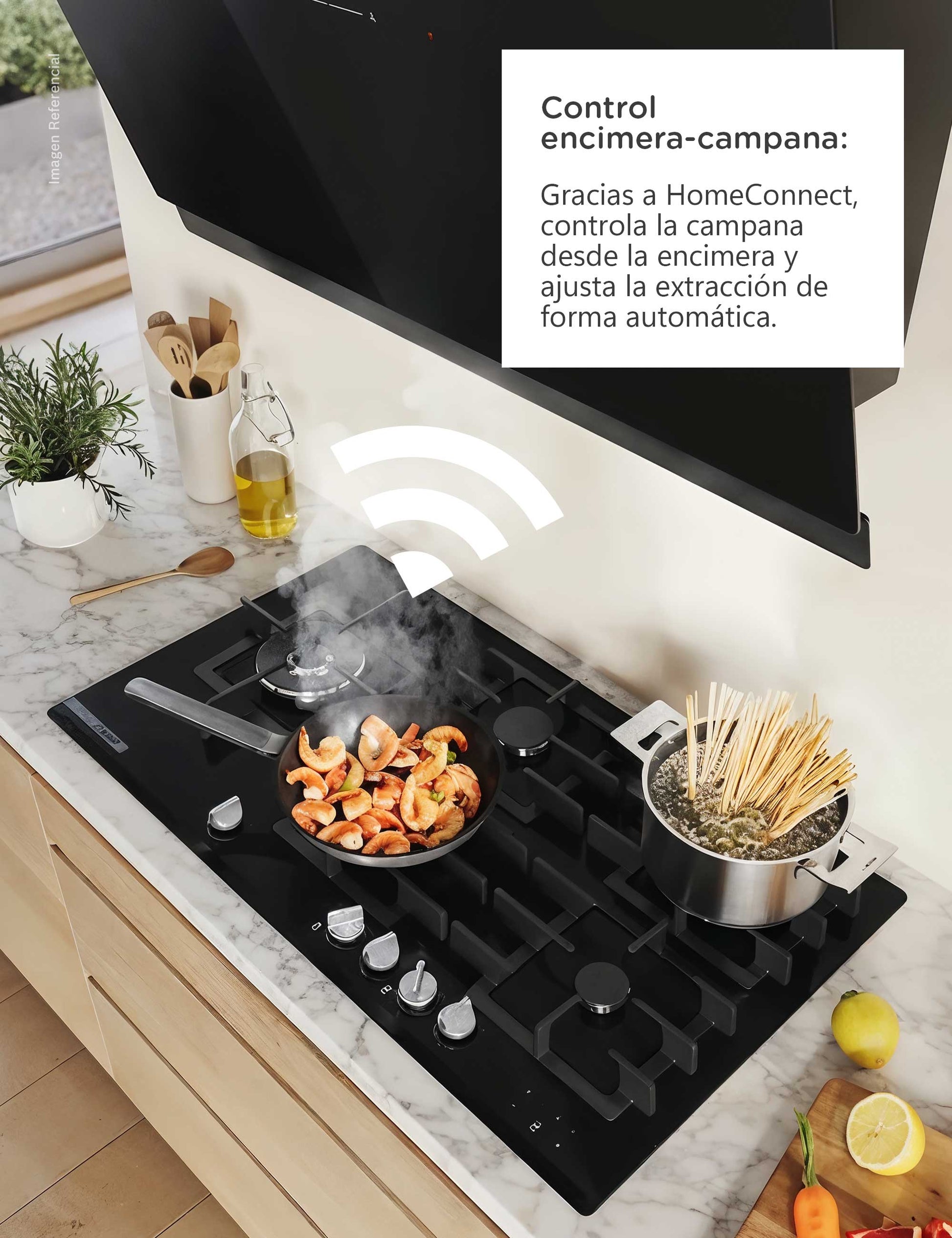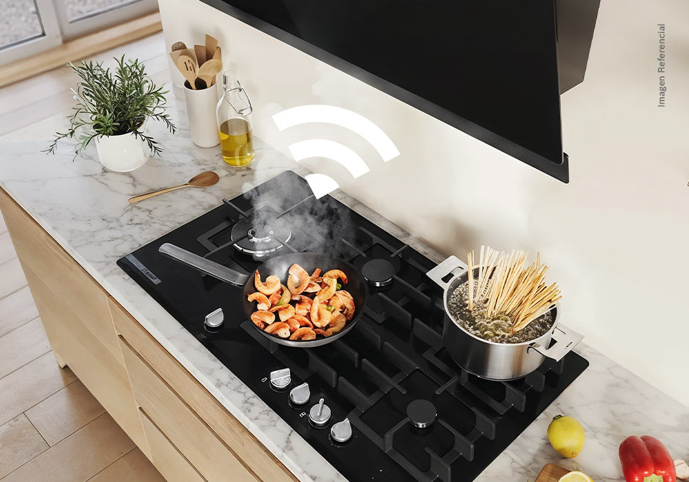 Disfruta de una cocina realmente inteligente. Al encender tu encimera a gas, la tecnología Home Connect vincula la campana automáticamente y la pone en funcionamiento, eliminando la necesidad de encenderla manualmente. El control final lo tienes en el Panel TouchControl de la encimera, donde puedes manipular la iluminación y las velocidades de la campana con precisión táctil. Además, este panel incluye un práctico Timer sonoro que te avisa con exactitud el final de cada tiempo de cocción.