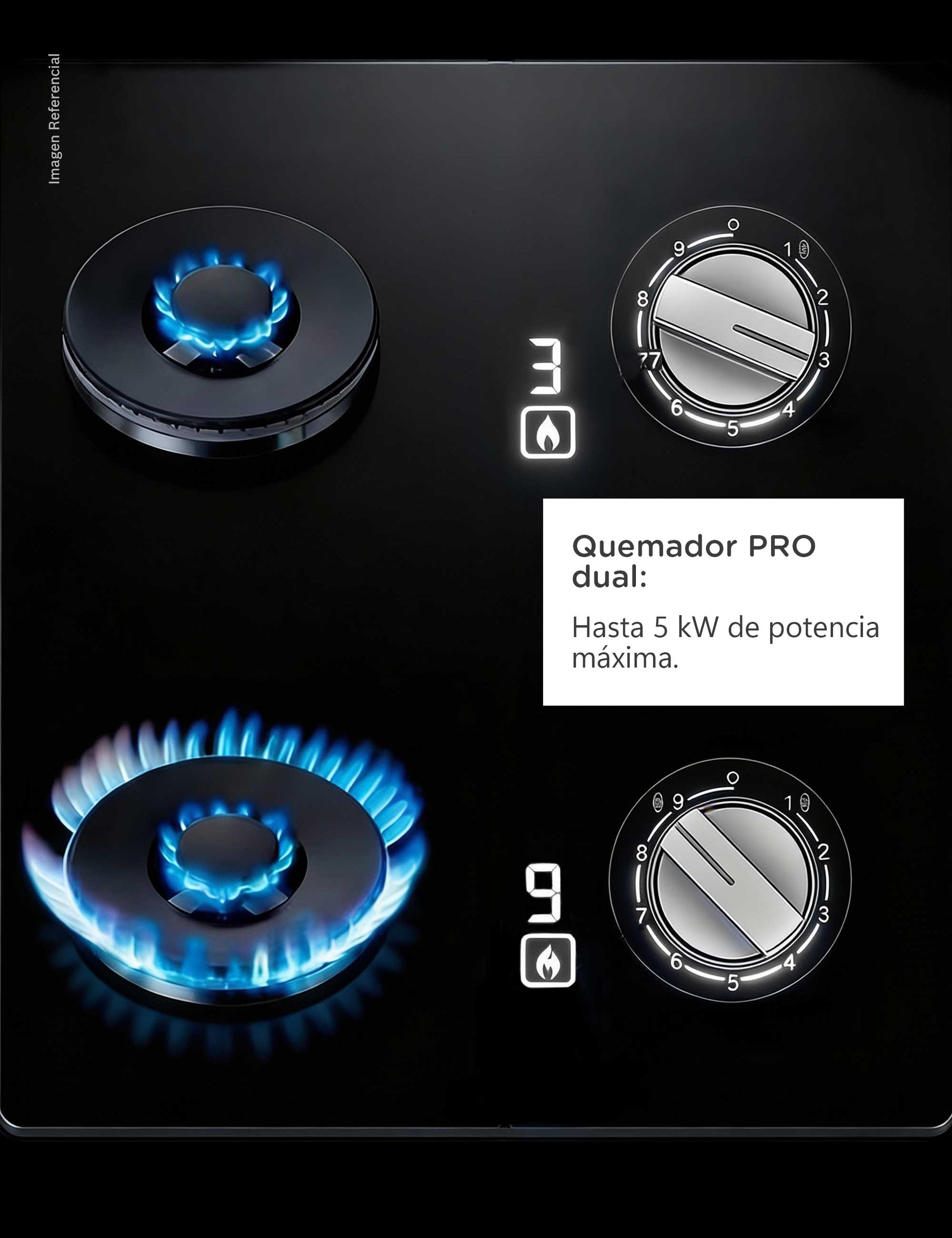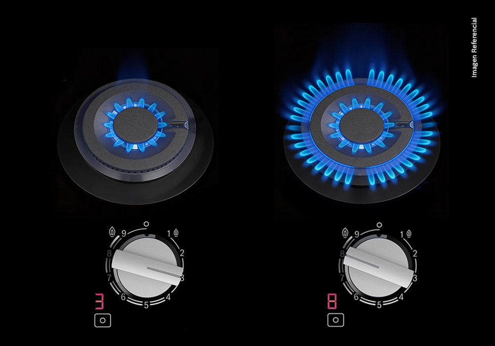 La tecnología al servicio de la precisión. Los Mandos Iluminados añaden un toque de elegancia moderna, pero su valor real reside en la claridad con la que muestran el nivel de potencia seleccionado y/o el calor residual que existe en la hornilla. Este detalle te ayuda a cocinar con la certeza de que estás utilizando la intensidad de llama precisa, mejorando tus resultados finales.Precisión en llama para máximo rendimiento