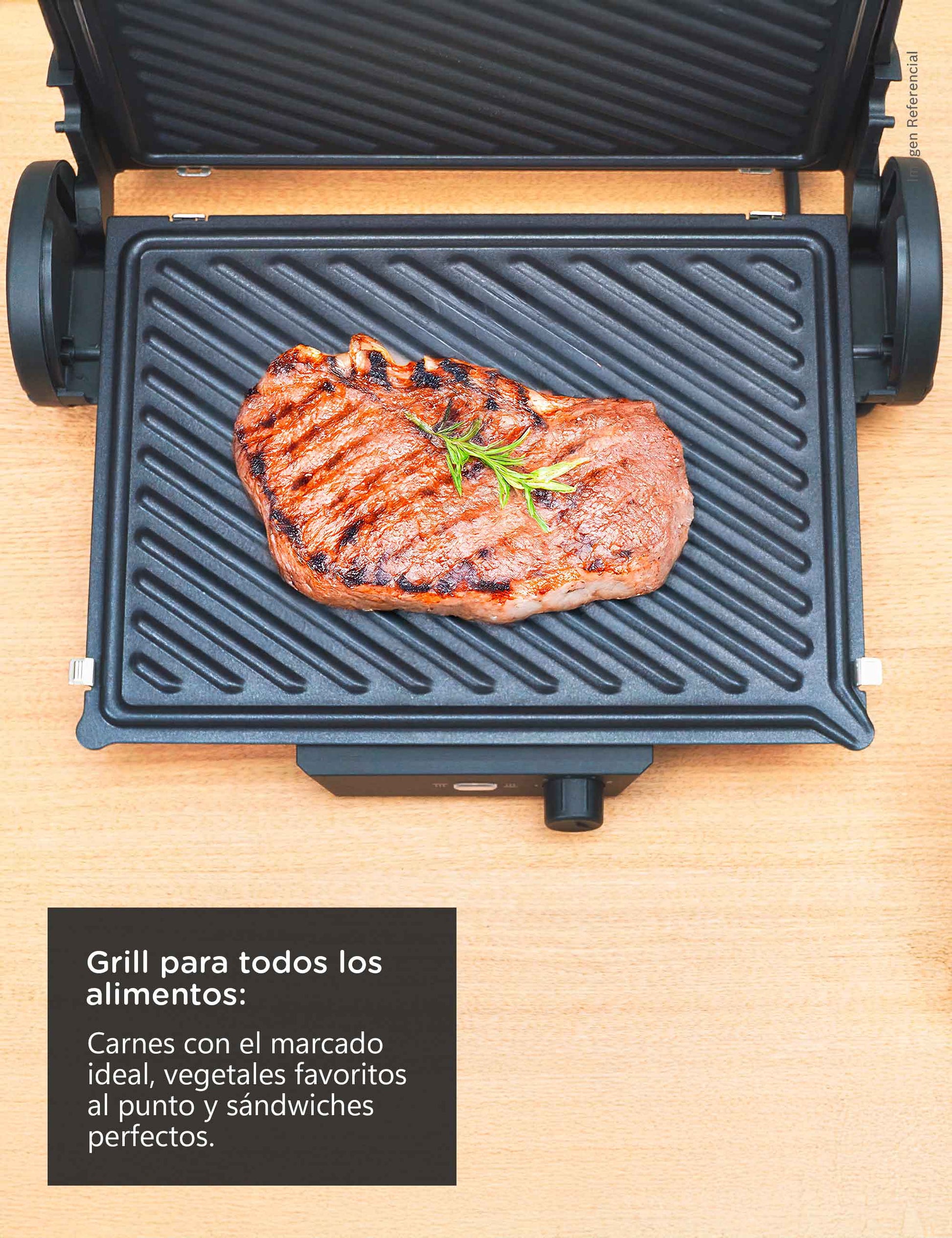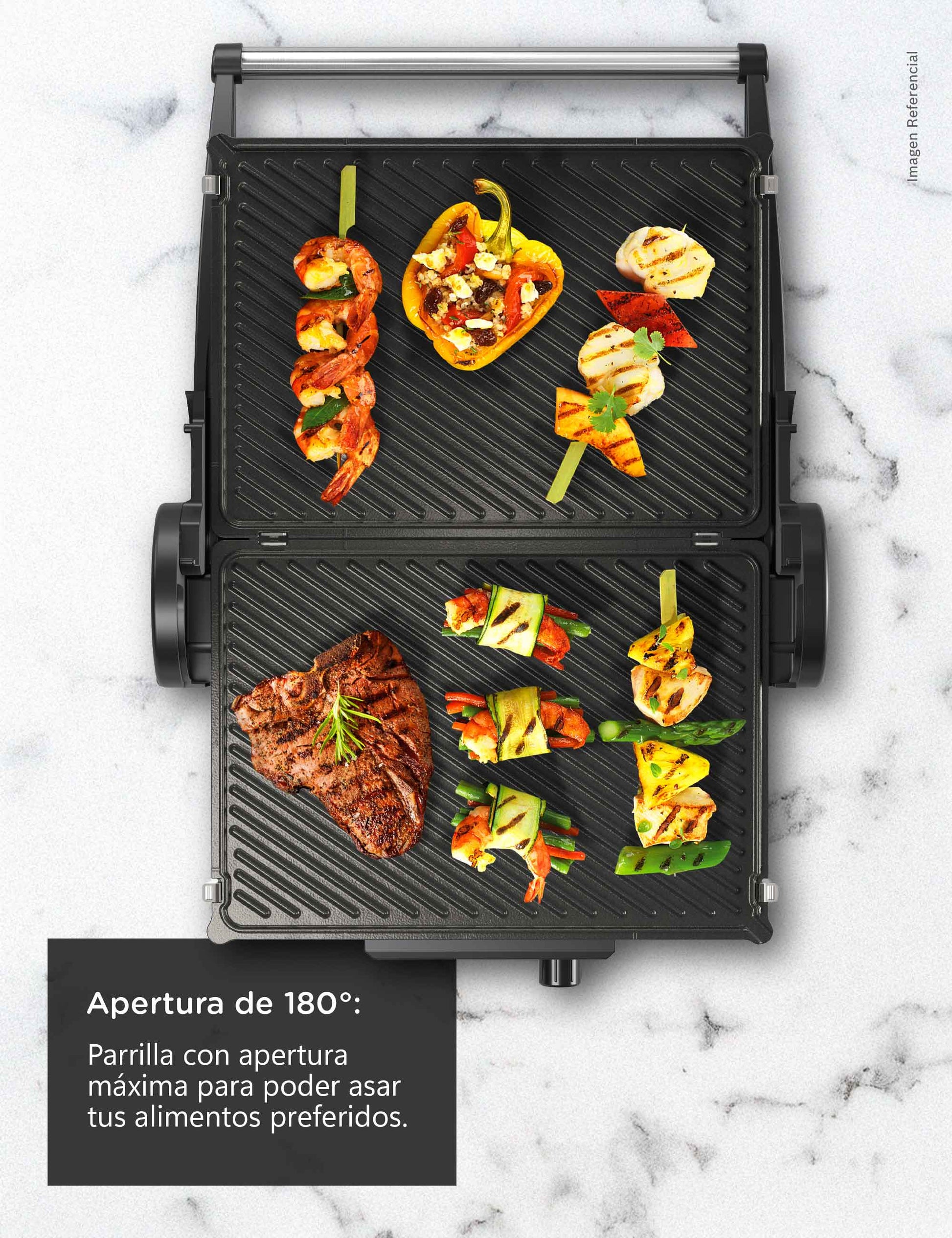 Disfruta de tres modos de cocción en un solo equipo. Úsala cerrada como grill para preparar hamburguesas o mixtos perfectos, abierta a 180° como parrilla para carnes, pescados o verduras y semiabierta para gratinar quesos o calentar pizza.Marcas Perfectas de Parrilla, Sabor Inigualable