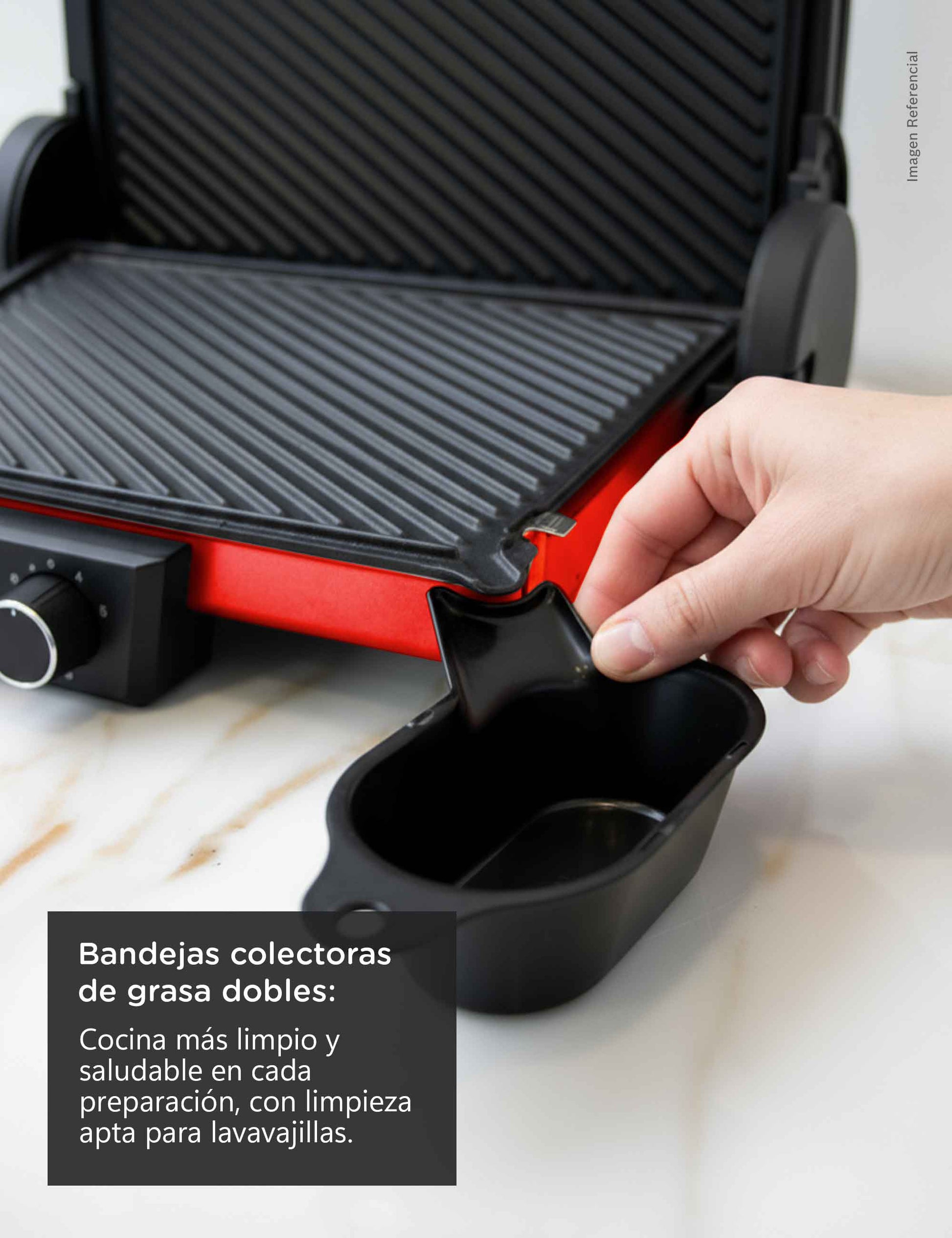 La parrilla incluye dos bandejas recoge grasas que mantienen la superficie limpia y ordenada durante la cocción. Cada elemento ha sido diseñado para facilitar tu experiencia, optimizando el uso y la limpieza sin comprometer el estilo ni el rendimiento.