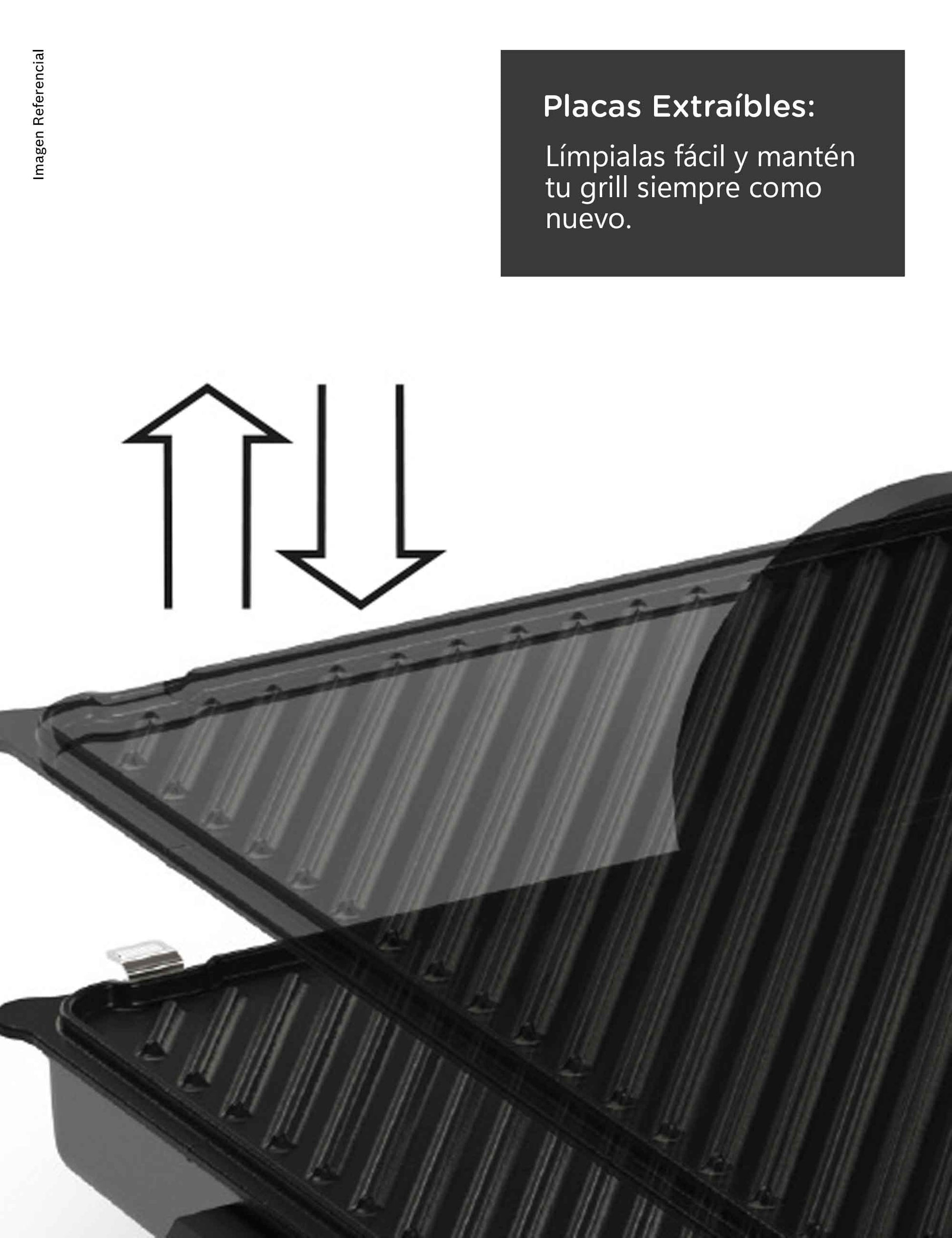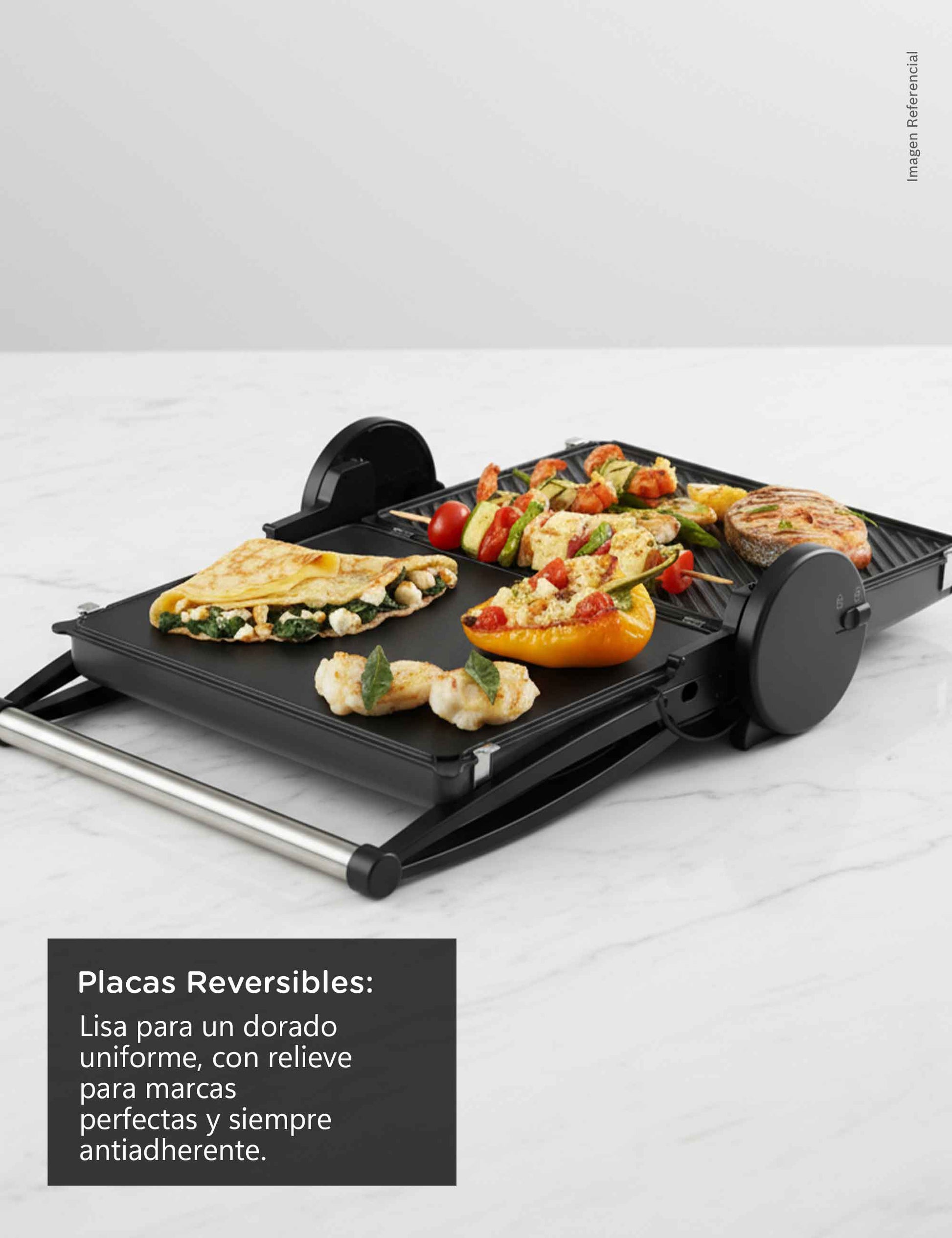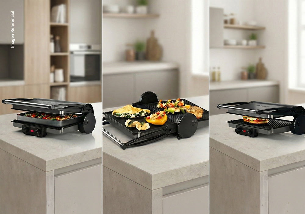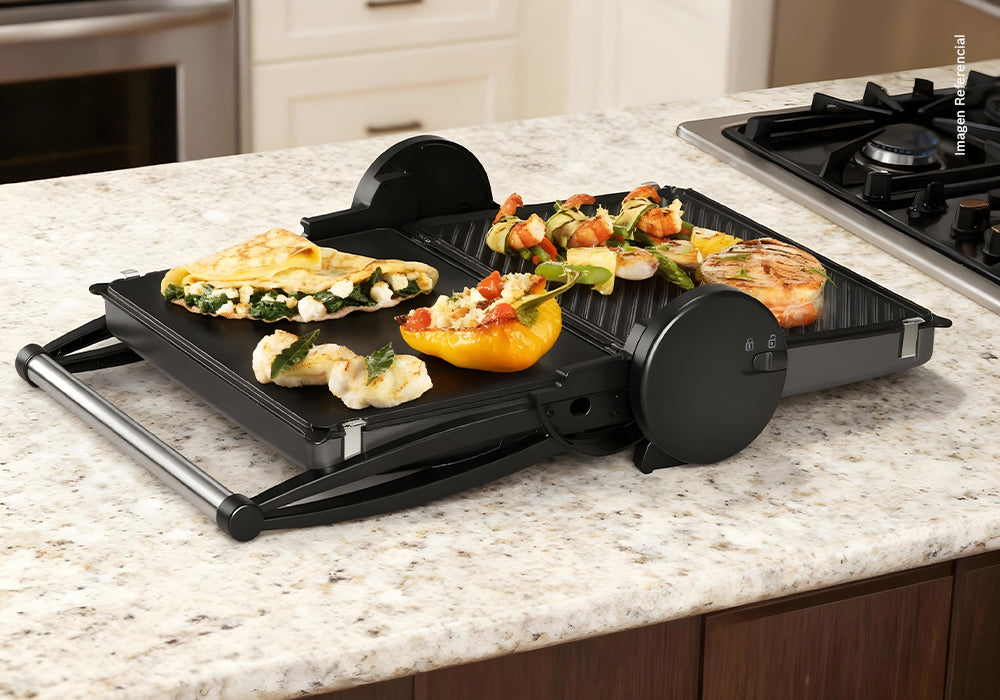 Disfruta de tres modos de cocción en un solo equipo. Úsala cerrada como grill para preparar hamburguesas o mixtos perfectos, abierta a 180° como parrilla para carnes, pescados o verduras y semiabierta con su bandeja para hornear o gratinar.Placas antiadherentes reversibles: doble textura, cero complicaciones