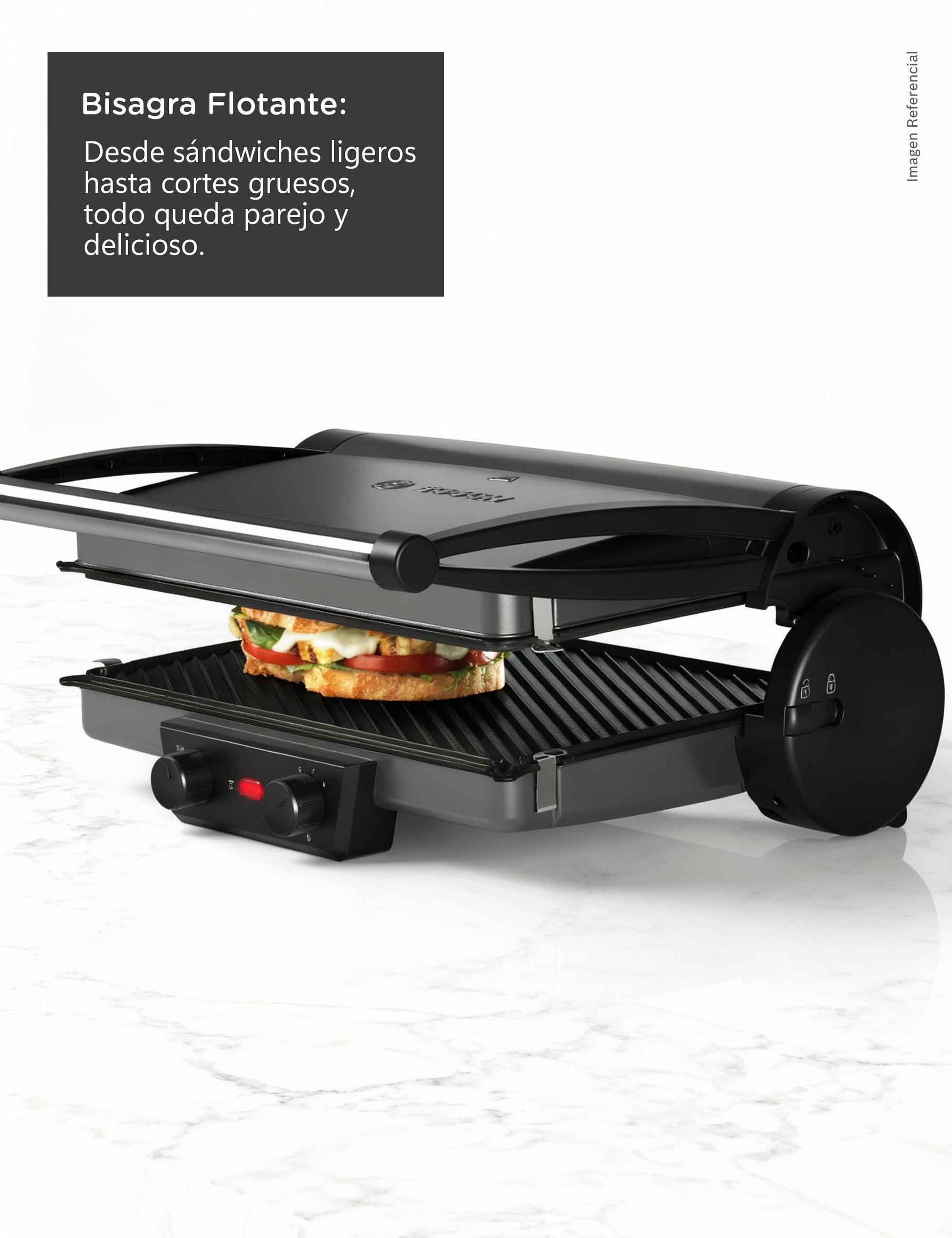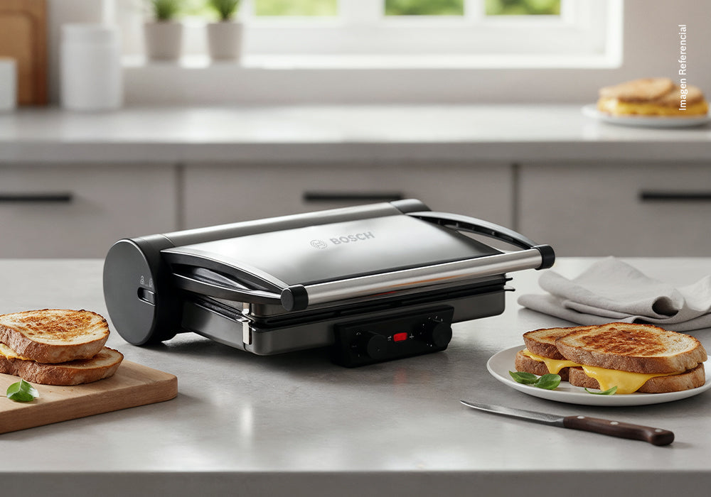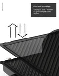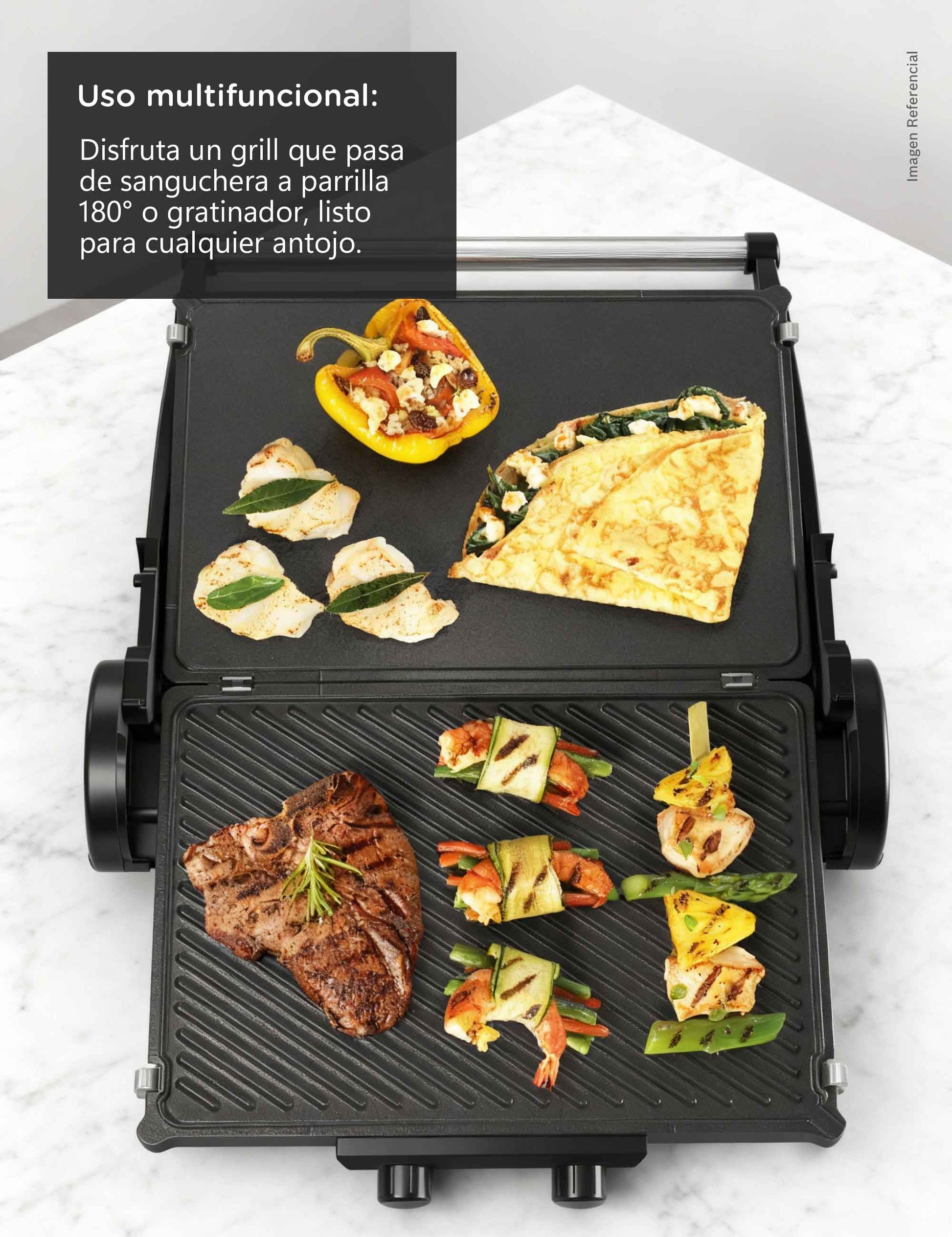Disfruta de tres modos de cocción en un solo equipo. Úsala cerrada como grill para preparar hamburguesas o mixtos perfectos, abierta a 180° como parrilla para carnes, pescados o verduras y semiabierta con su bandeja para hornear o gratinar.Placas antiadherentes reversibles: doble textura, cero complicaciones