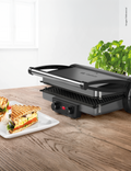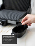 Sus placas de 33 x 23 cm son reversibles, con un lado liso ideal para cocinar pescados, vegetales o tortillas y otro acanalado perfecto para marcar carnes o lograr el clásico acabado de parrilla. Su recubrimiento antiadherente evita que los alimentos se peguen y facilita la limpieza después de cada uso.Control de temperatura independiente, resultados a tu medida