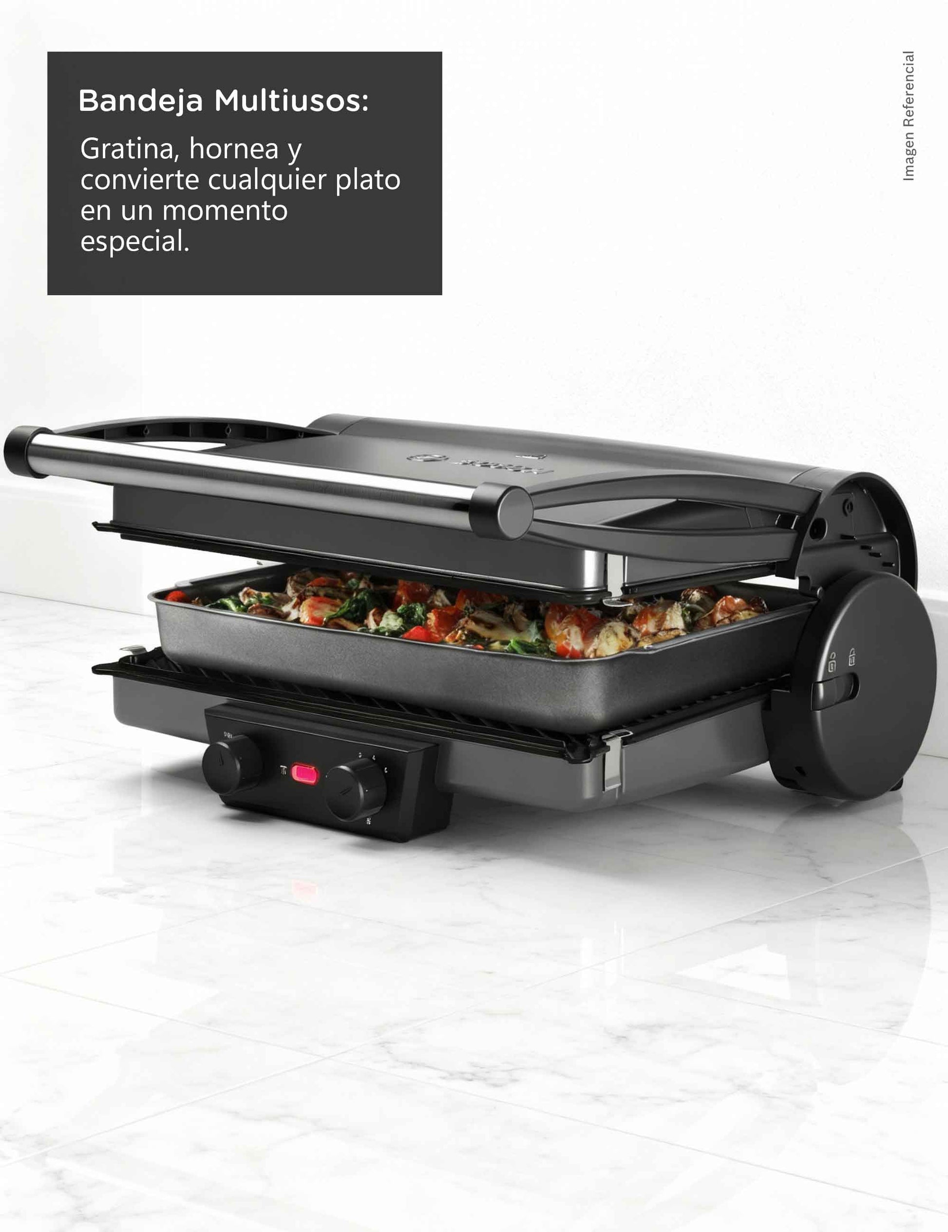 La parrilla incluye una bandeja especial para gratinar y hornear (lavable en lavavajillas), perfecta para crear recetas al horno con un acabado dorado, y dos bandejas recoge grasas que mantienen la superficie limpia y ordenada durante la cocción.Marca