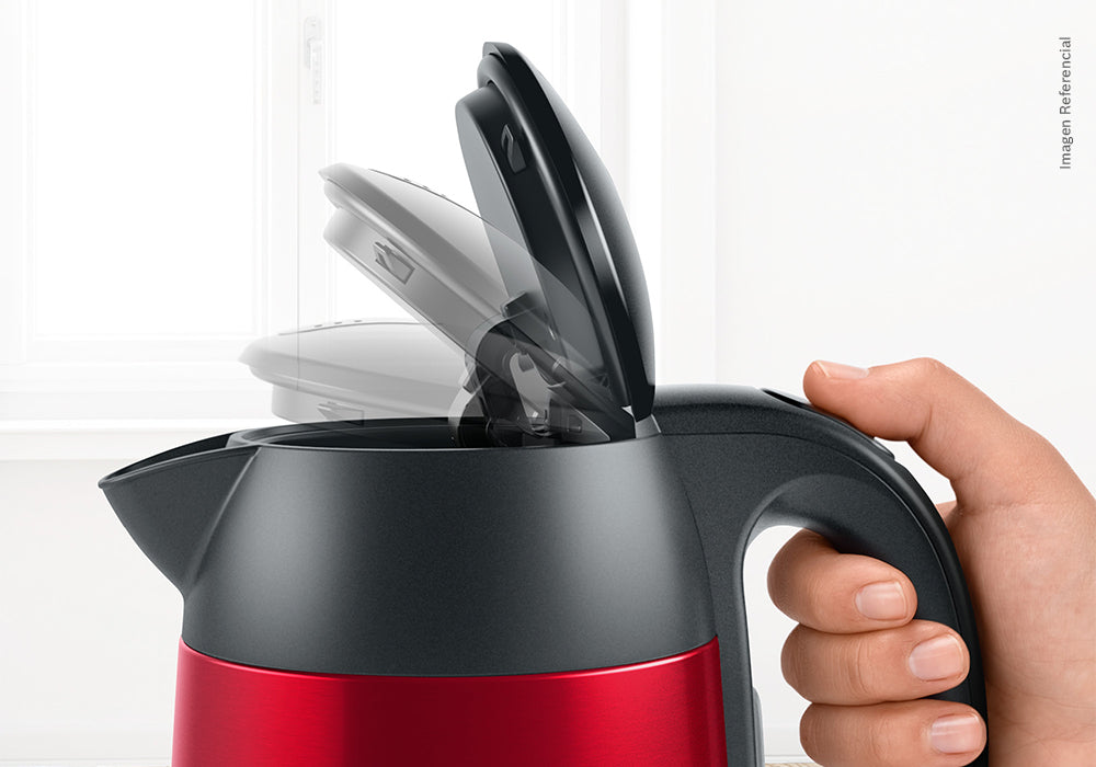 Diseñado para un uso rápido y sin esfuerzo, la asa con botón de apertura permite con un solo dedo, abrir la tapa automáticamente hasta 90°, haciendo más cómodo el proceso de llenado.