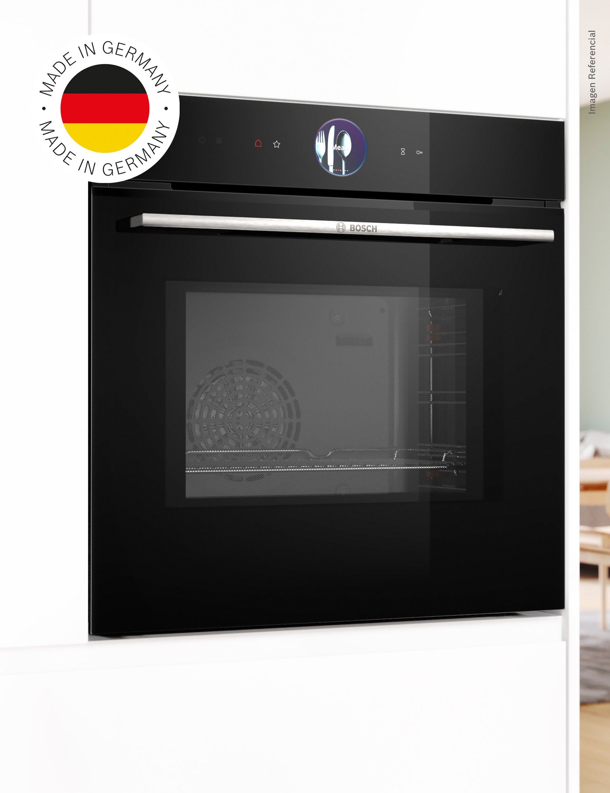 El horno empotrado Bosch con función Microondas, Home Connect, Air Fry, Calentamiento 4D, Limpieza Hidrolítica y pantalla táctil TFT con anillo de control Touch.