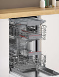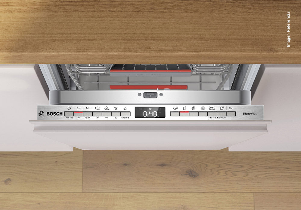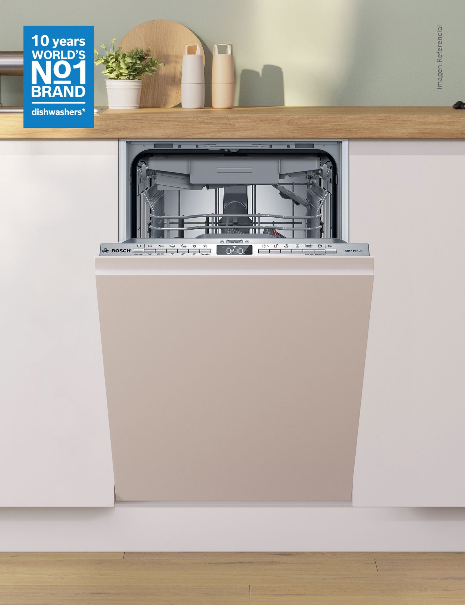 Lavavajillas integrable Bosch Serie 4 de 45 cm, con capacidad para 10 servicios, Home Connect, 7 programas y 4 funciones especiales. Incluye VarioDrawer Plus y RackMatic para una organización flexible, además de secado con apertura automática de puerta. Consume solo 8.7 L de agua, ofreciendo un ahorro excepcional.