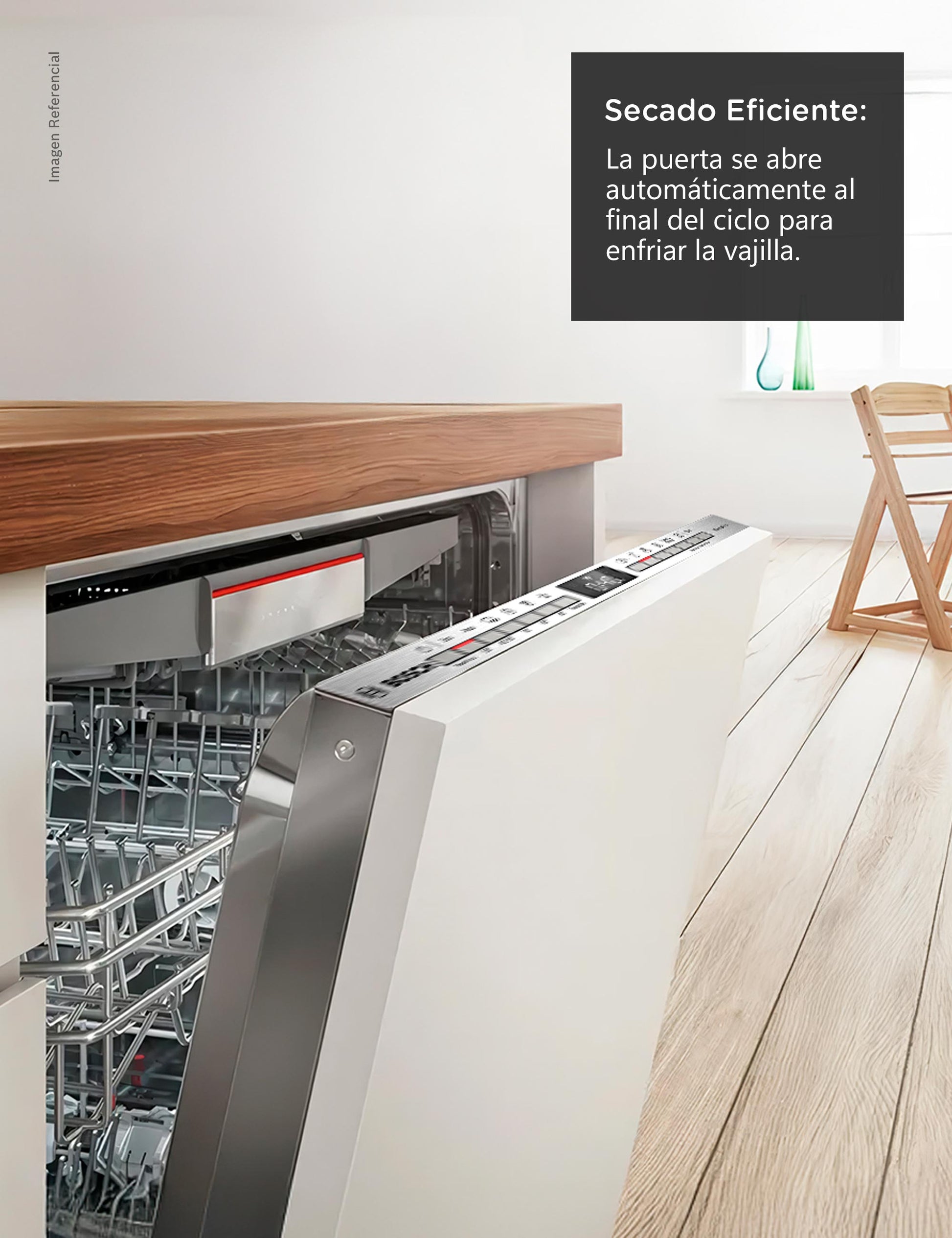 Tu lavavajillas opera a un nivel sonoro excepcionalmente bajo de hasta 44 dB. Para ponerlo en perspectiva, esto es mucho más bajo que los 50 dB de una conversación o de un teléfono común. Este nivel de silencio absoluto te permite tener tu lavavajillas en cocinas abiertas o activarlo de noche sin interrumpir tu vida o tu descanso.
