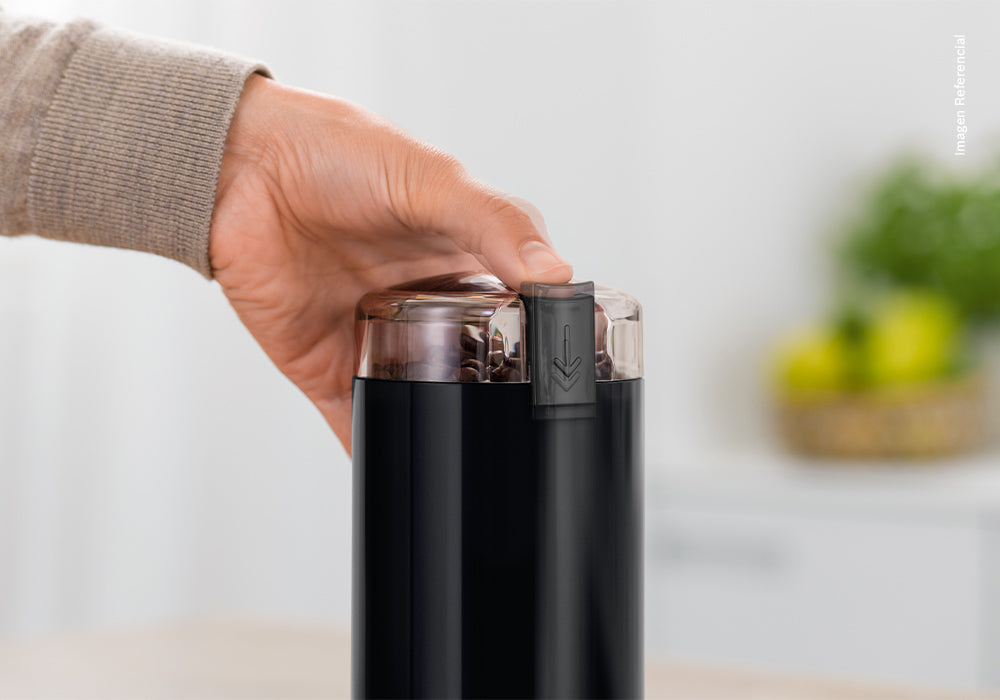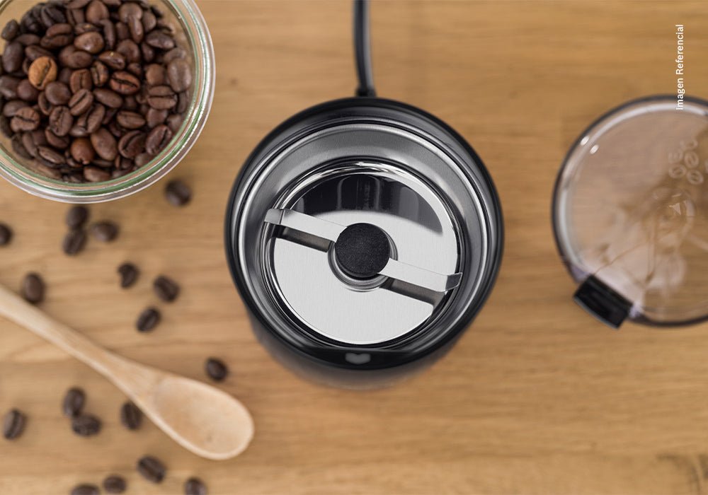 Molinillo de café con cuchillas de acero inoxidable que pulverizan el café, capacidad de 75g para café molido, pestillo de seguridad.
