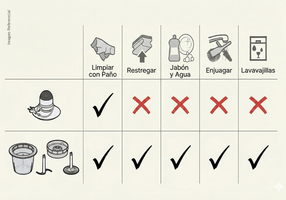 Olvídese de lavar a mano después de cada uso. Todas sus piezas son aptas para lavavajillas, incluyendo el vaso, las cuchillas y el accesorio batidor.Marca