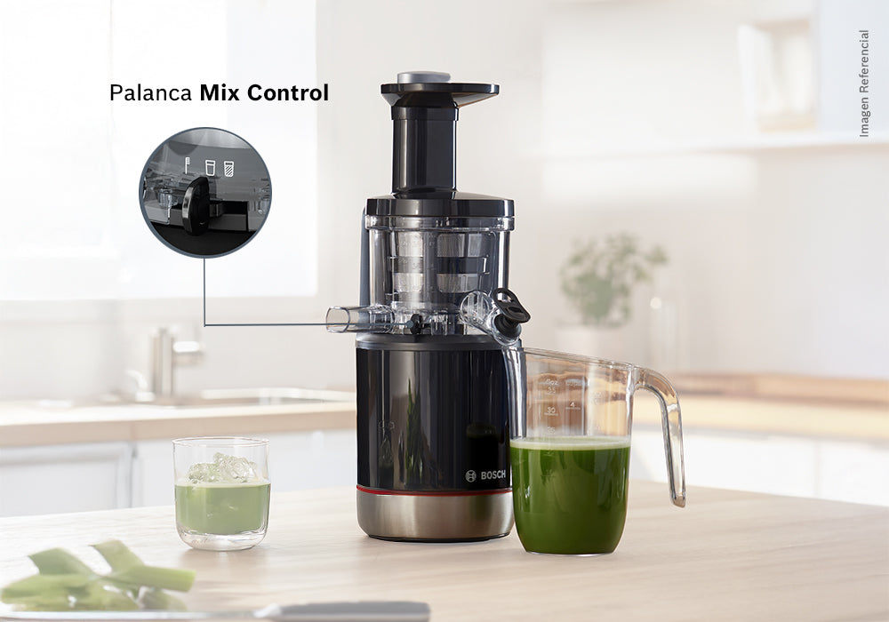 Personaliza cada mañana tu jugo, la palanca Mix Control te permite decidir cuánta pulpa deseas en tu jugo, ofreciendo la libertad de crear desde bebidas ligeras y claras hasta jugos más densos.