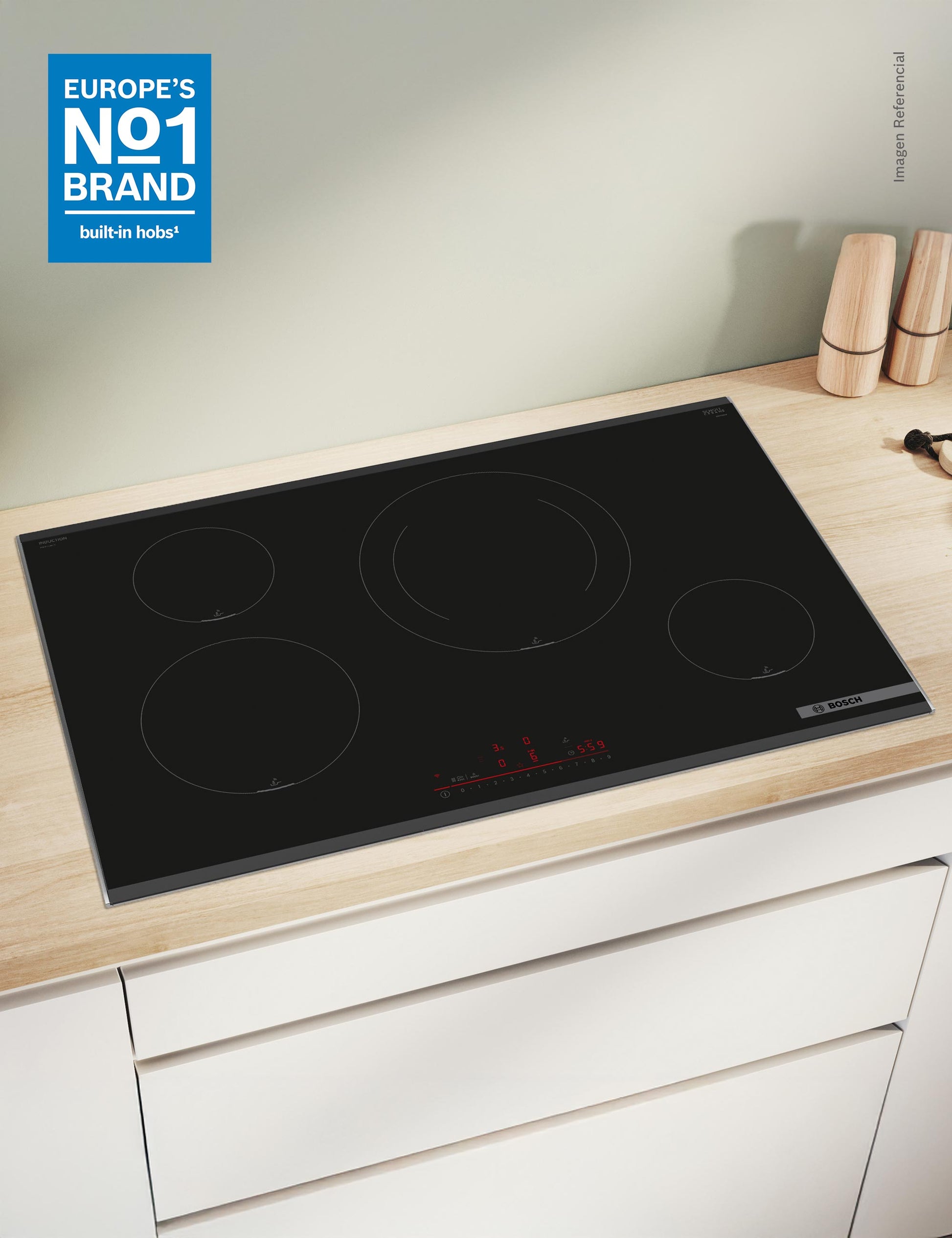 Vitrocerámica de Inducción de 80cm Bosch diseño elegante con HomeConnect, DirectSelect Plus, PerfectFry Plus, programa favorito, función pausa que hace que cocinar y limpiar sea especialmente fácil.